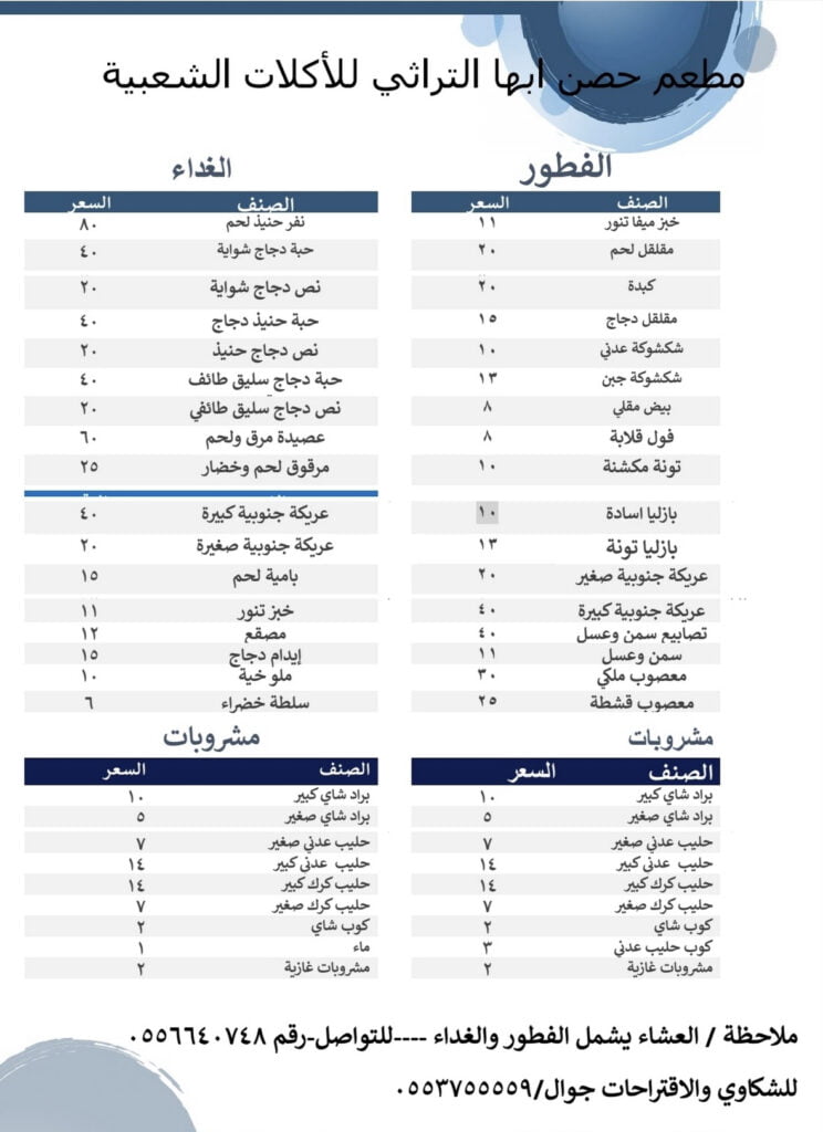 منيو مطعم حصن أبها التراثي أبها